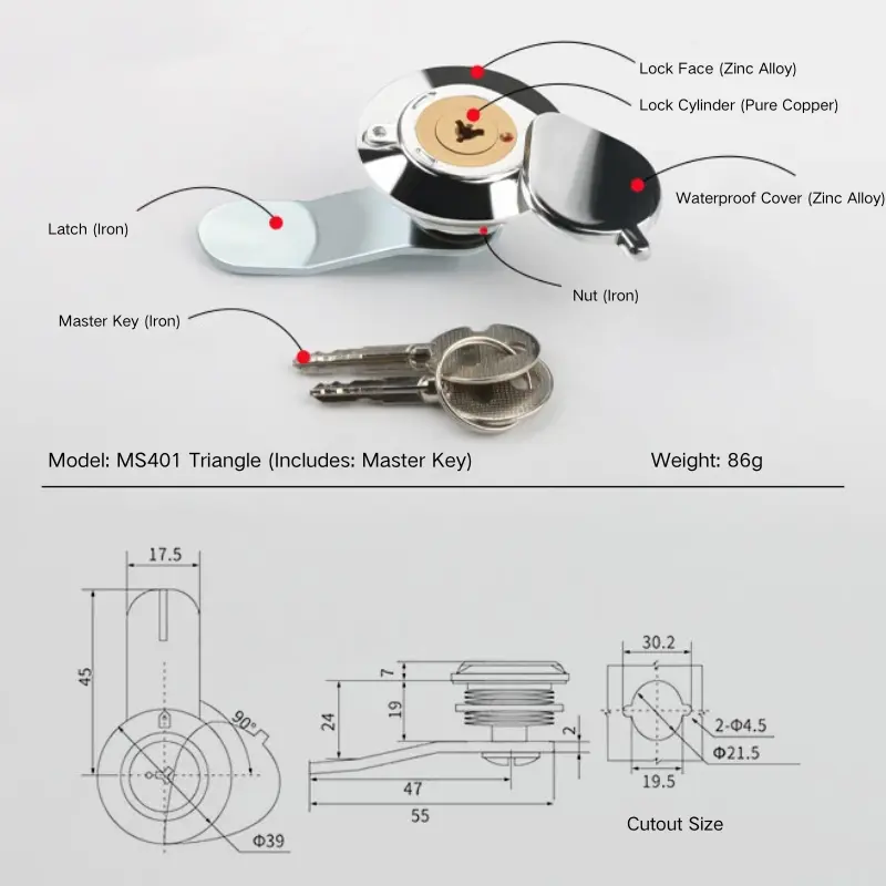 Cosnaíonn clúdach an ghlais uiscedhíonach lasmuigh seo an sorcóir glasála, ag leathnú a shaol seirbhíse. Trí ábhair éagsúla a chomhcheangal, tá bailchríoch chrome geal ag na comhpháirteanna cóimhiotail since. Oiriúnach do thiús painéil dorais 1-6mm, féadfaidh tomhaltóirí a roghnú cibé acu an roghnaíonn siad an múnla clúdaigh uiscedhíonach seo bunaithe ar a gcuid riachtanas. Maidir leis an glas babhta beag seo, cuirimid leagan sorcóir glas tras-chruthach ar fáil freisin gan an clúdach uiscedhíonach. Roghnaigh máistir-eochracha nó eochracha uathúla de réir riachtanais bhainistíochta.
